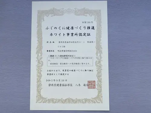「社員にいつまでも健康で働いてもらえる」ことを願い、当社では県が推進する「ふじのくに健康づくり推進事業所」の認定を受けて、健康増進活動に取り組んでいます。