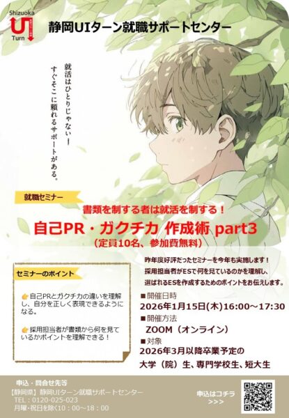静岡UIターン就職サポートセンターでは、就職試験を控えている方向けに、選ばれるエントリーシートを作成するためセミナーを開催します。