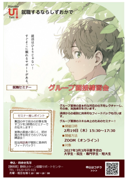 静岡UIターン就職サポートセンターでは、就職試験を控えている方向けに、グループ面接練習会を開催します。
